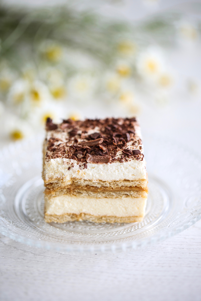 Tak przygotowaną masę wylewamy na herbatniki, wyrównujemy i pokrywamy kolejną warstwą herbatników. Ciastka pokrywamy dokładnie masą kajmakową i układamy kolejną warstwę herbatników.