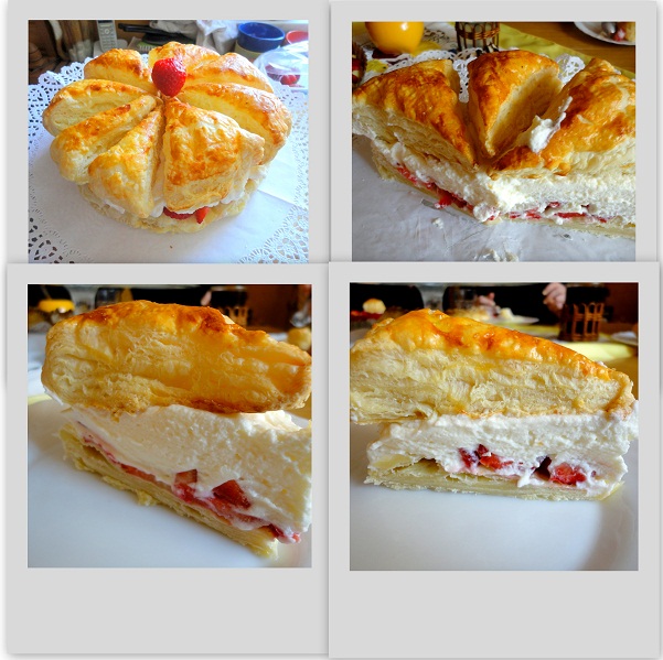 Prostokątny płat ciasta francuskiego złożyć na pół i delikatnie rozwałkować żeby powstało koło. Tak samo postąpić z drugim opakowaniem, przy czym koło dodatkowo przekroić na trójkąty i posmarować rozbełtanym jajkiem.  Tak przygotowane ciasta włożyć do piekarnika nagrzanego do 200 C i piec przez ok 20 min do zarumienienia się ciasta. Dodatkowo pełne koło, które będzie stanowiło spód ciasta można obciążyć np. spodem od tortownicy, aby ciasto nam za bardzo nie wyrosło, jeśli tego nie zrobimy wystarczy później delikatnie przebić wyrośnięte ciasto, aby trochę opadło.