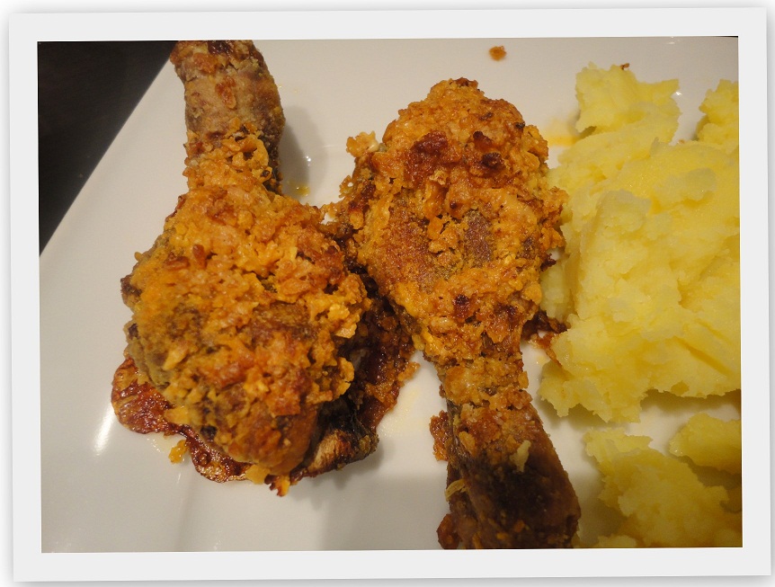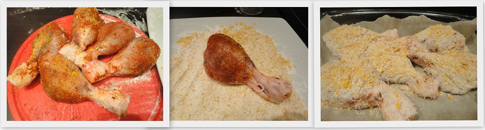 Kurczaka umyć i ściągnąć skórę (chyba, że oczywiście ją lubicie : ) Natrzeć przyprawami, tak aby całe mięso było pokryte. Płatki kukurydziane rozdrobnić, można to zrobić tłuczkiem do mięsa lub blenderem i wymieszać z mąką. Pałki kurczaka panierować w mące z płatkami, dokładnie przyciskając, aby dobrze się przykleiły.