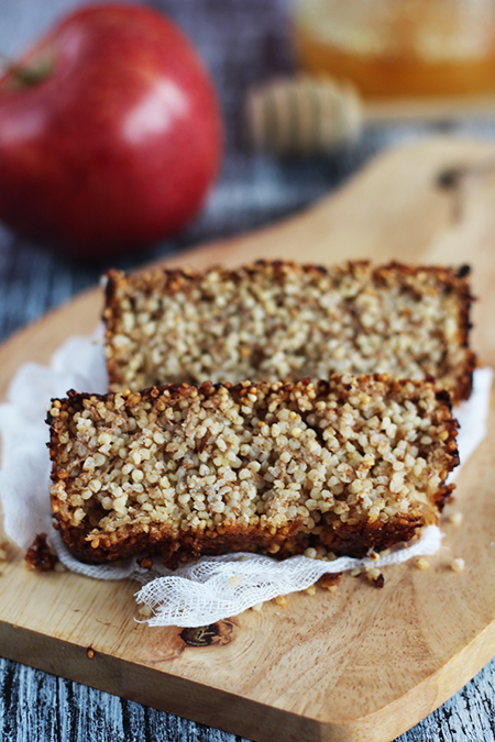 Jabłka obrać, wyciąć gniazda nasienne, zetrzeć na małych oczkach tarki. Dodać nieugotowaną kaszę jaglaną i pozostałe składniki. Przełożyć do keksówki wysmarowanej masłem i wysypanej bułką tartą. Piec w rozgrzanym do 180 C (termoobieg) piekarniku przez ok 90 minut. Studzić na kratce.