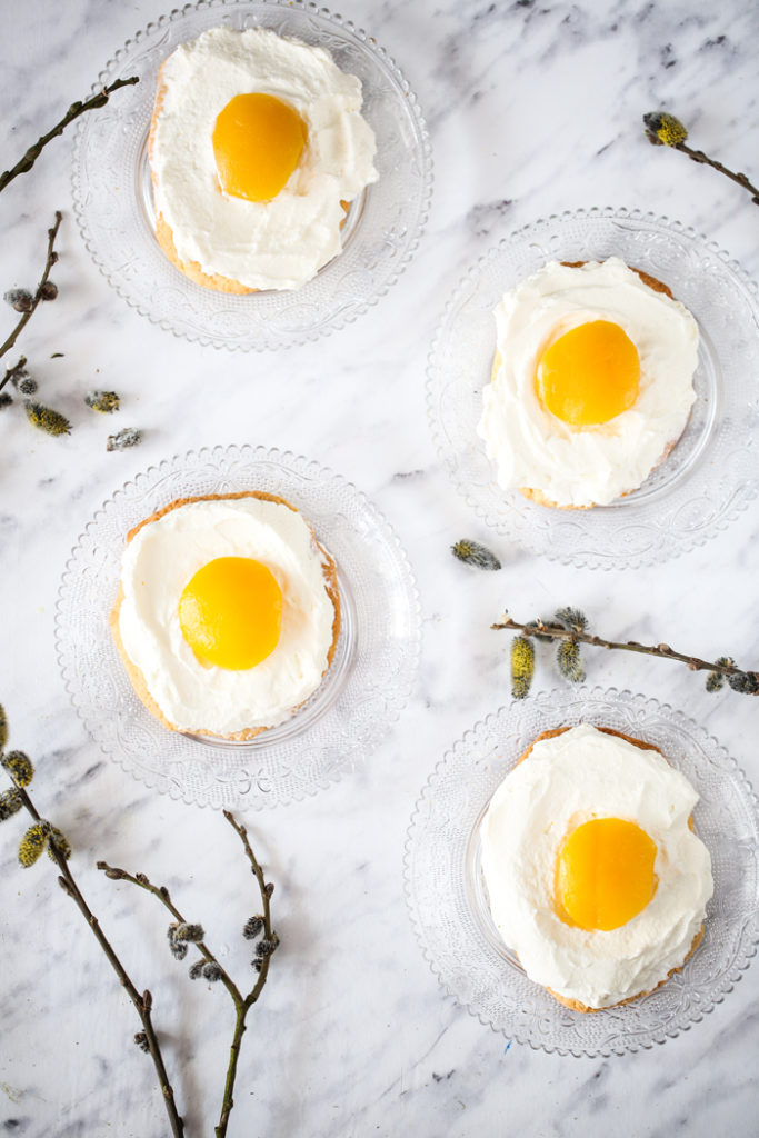 Kremówkę, mascarpone i cukier puder zmiksować do uzyskania gładkiego kremu. Przełożyć na przestudzone ciastka przy pomocy łyżki. Kremu nie trzeba wyrównywać, „niedbale” ułożony sprawia bardziej realistyczne wrażenie ; ) Na środku każdego ciasteczka ułożyć połówkę odsączonej z soku/zalewy moreli lub brzoskwini. Jeśli używacie brzoskwiń być może konieczne będzie podzielenie połówki na pół i przycięcie kształtu nożem, aby „żółtko” nie było zbyt duże w stosunku do całego jajka. Opcjonalnie udekorować startą gorzką czekoladą, która imituje pieprz : )