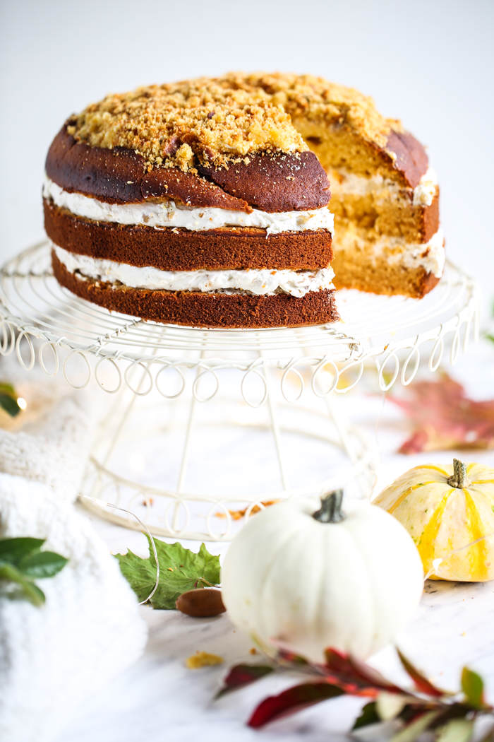 Jajka zmiksować z cukrem na jasną, puszystą masę. Nie przerywając miksowania, cienką strużką dolewać olej, a następnie miód. Zmiksować do połączenia się składników, a następnie dodać puree z dyni i ponownie krótko zmiksować. Dodać mąkę przesianą z proszkiem do pieczenia i delikatnie wymieszać silikonową szpatułką lub na najniższych obrotach miksera, tylko do połączenia się składników. Przelać do tortownicy, z dnem wyłożonym papierem do pieczenia i piec w piekarniku rozgrzanym do 180 C (termoobieg) przez ok. 50 minut, do suchego patyczka. Wyjąć z piekarnika i ostudzić, a następnie odciąć wierzch ciasta z górką, pokruszyć i odłożyć do dekoracji. Pozostałe ciasto przekroić na 3 równe blaty.