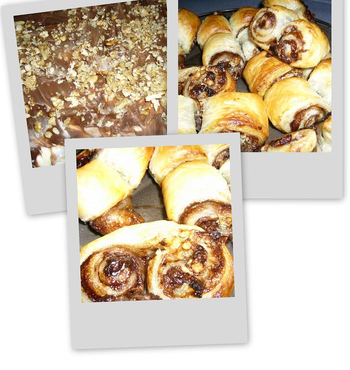 Ciasto rozkładamy na stolnicy, smarujemy kremem i posypujemy orzechami. Zwijamy wzdłuż dłuższego boku, ale tylko do połowy. To samo robimy z drugiej strony. Powstałe w ten sposób dwa ruloniki smarujemy na złączeniu wodą, aby się nie skleiły, a następnie kroimy w plastry. Plastry układamy na blasze (tak aby czekolada była widoczna na dole i na górze; możemy je też lekko spłaszczyć dłonią).