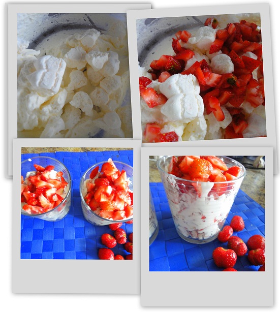 Umyte truskawki, odszypułkować, pokroić na kawałki, zasypać cukrem i dodać sok z granatów, odstawić (sok z granatów nie jest konieczny, można truskawki trochę rozgnieść widelcem, by puściły trochę własnego soku). Kremówkę ubić do gęstości, osobiście nie mogłam się powstrzymać i ubiłam do całkiem sztywnej ; )