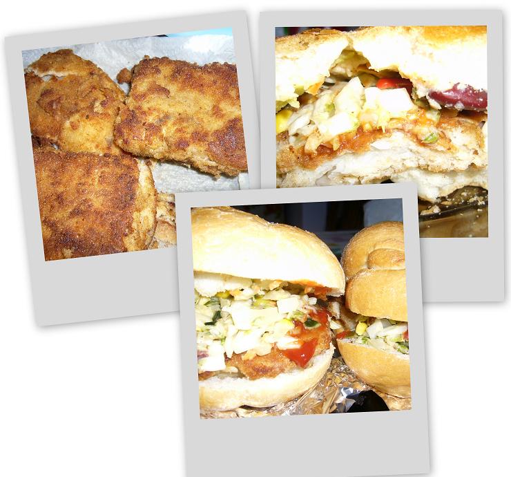 Bułki rozcinamy, lecz obie części pozostawiamy nadal połączone. Do środka kładziemy przygotowane filety rybne, polewamy ketchupem, a następnie nakładamy ulubioną surówkę. (Na początku można dodać też plasterek żółtego sera)