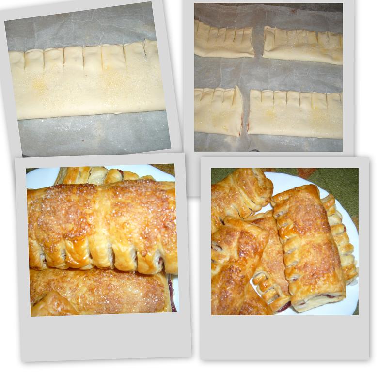 Ciasto francuskie kroimy na prostokąty, każdy z nich smarujemy marmoladą i składamy na pół. Na jednym z dłuższych boków robimy nacięcia ( tak jak widać na zdjęciu ; ) Smarujemy roztrzepanym jajkiem i sypiemy cukrem.
