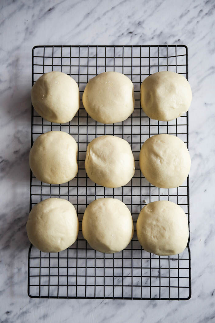 Do letniego mleka dodać rozkruszone drożdże oraz 1/2 łyżki cukru. Zaczyn wymieszać, przykryć ściereczką i odstawić do wyrośnięcia w ciepłe miejsce. W tym czasie rozpuścić masło, a żółtko utrzeć z 1 łyżką cukru. Dodać do wyrośniętego zaczynu, razem z solą i rozpuszczonym masłem.Wymieszać i stopniowo dodawać mąkę wyrabiając ciasto. Powinno być elastyczne i ładnie odchodzić od ręki. Ciasto odstawić w ciepłe miejsce do podwojenia objętości, a następnie rozwałkować na grubość ok. 2-3 cm. (Stolnicę można delikatnie podsypać mąką.) Szklanką wykrawać kółeczka i odstawić do wyrośnięcia.