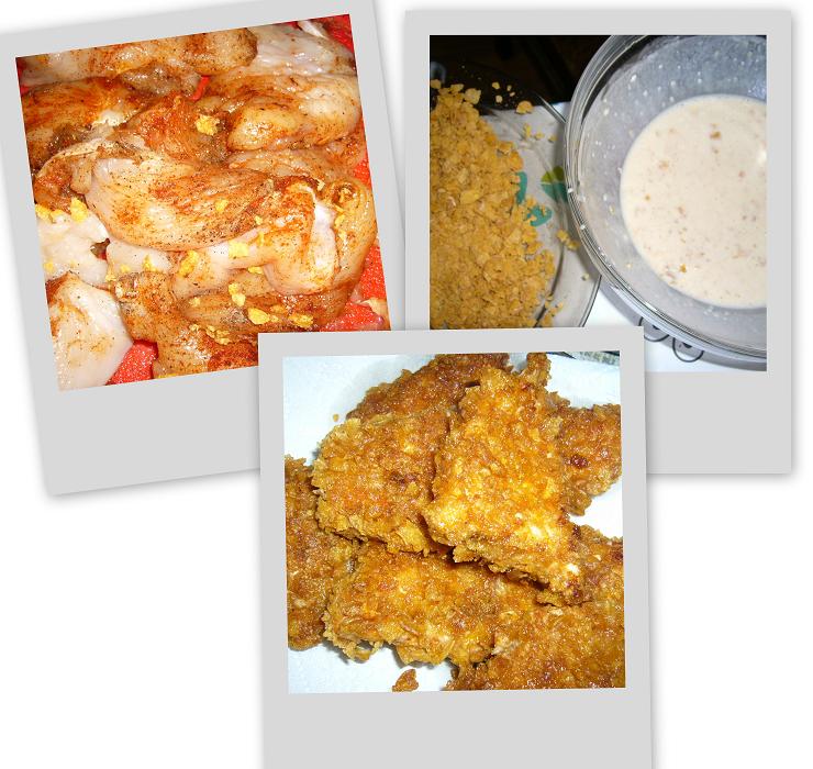 Mięso pokroić na mniejsze kawałki w zależności od tego jak duże lubimy, posypać słodką papryką, pieprzem i sola z obu stron, a następnie maczać w cieście. Pozwolić ciastu spłynąć z nadmiaru i obtoczyć filety w rozkruszonych płatkach.