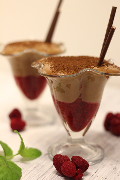 Przed podaniem dekorujemy kakao, malinami oraz czekoladowymi paluszkami.