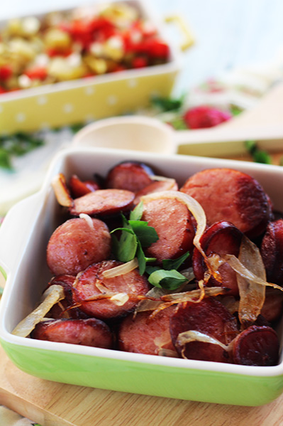 Na pewno zdarzają Wam się dni, kiedy nie ma czasu dosłownie na nic, ale jeść coś trzeba… ; ) Otwieram wtedy lodówkę z nadzieją, że znajdzie się w niej coś ciekawego, dzięki czemu nie będę musiała iść na zakupy ; ) Daniem idealnym w takiej chwili jest smażona kiełbasa z cebulką. Dosłownie 2 składniki wystarczą, aby uratować sytuację ; ) Według mnie najsmaczniejsza w towarzystwie tłuczonych ziemniaków! Polecam ; )