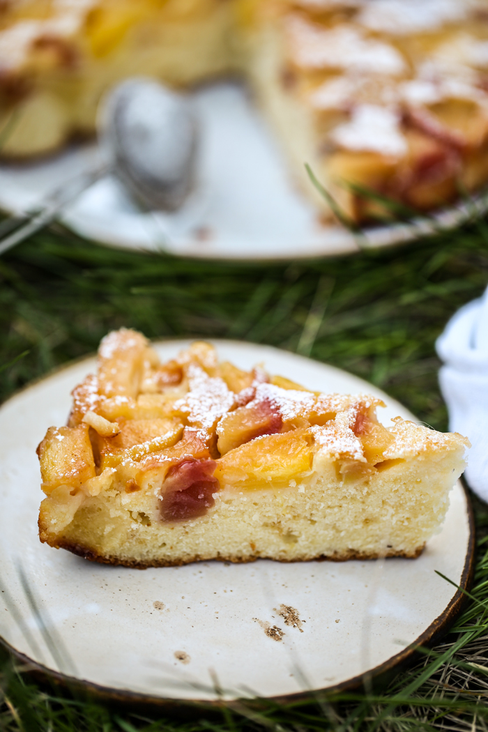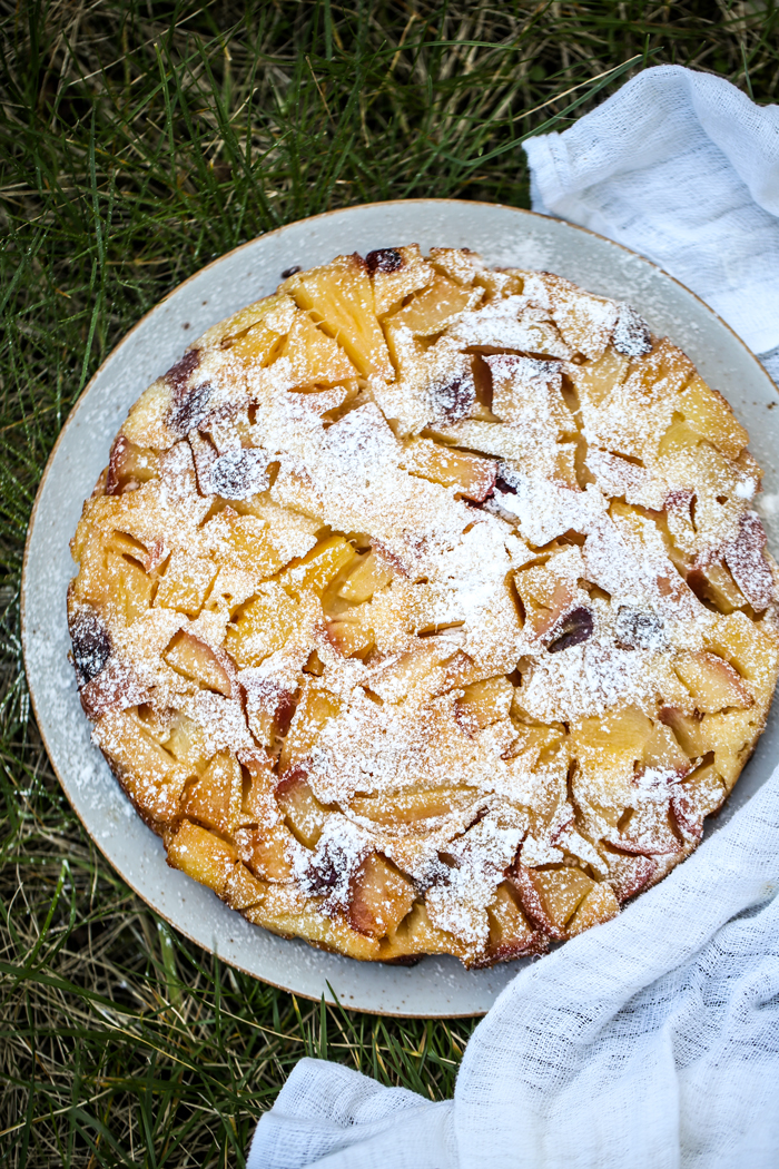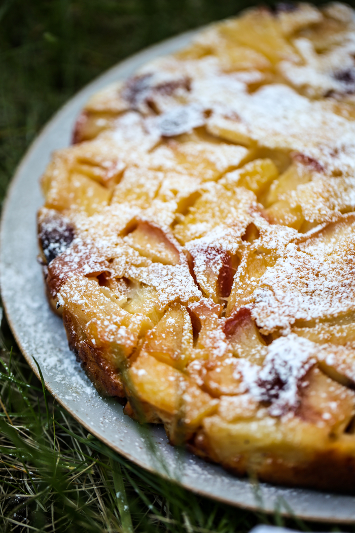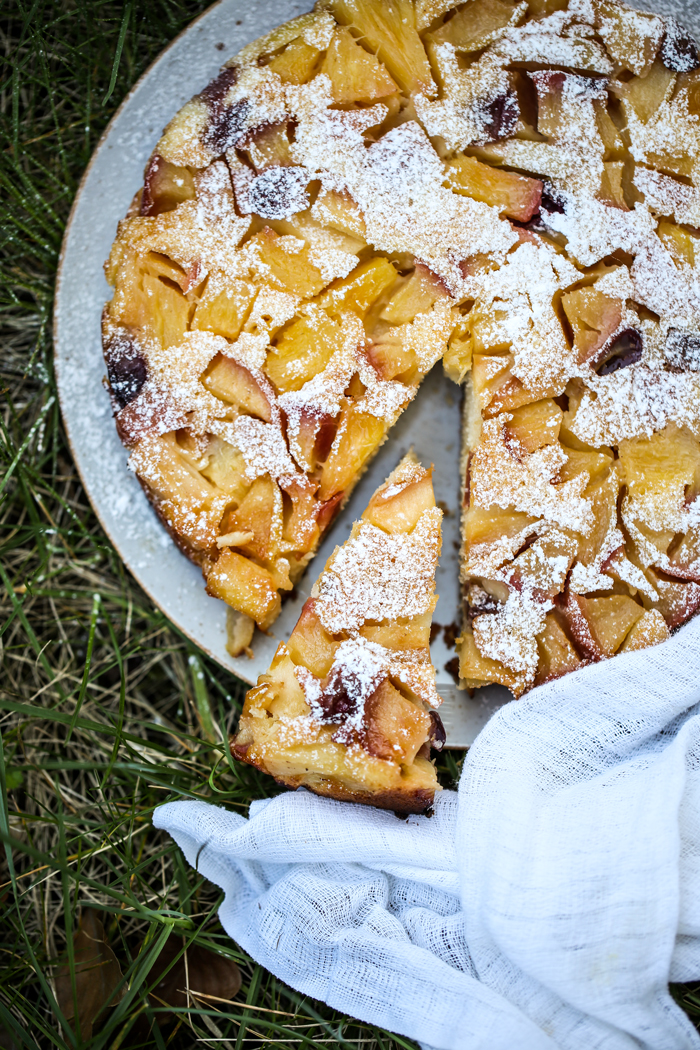 Owoce pokroić na mniejsze kawałki i podsmażyć na maśle, przez kilka minut aż zmiękną. W misce wymieszać mąkę z proszkiem do pieczenia i solą. Dodać jajka, cukier i mleko, wymieszać. Dodać rozpuszczone i przestudzone masło, ponownie wymieszać trzepaczką. Tortownicę wyłożyć papierem do pieczenia. Dno wypełnić owocami, a następnie wlać ciasto. Piec w piekarniku rozgrzanym do 180 C (termoobieg) przez ok. 40 minut. Wyjąć z piekarnika, blachę przykryć talerzem i odwrócić tak, aby talerz znalazł się na dole. Wyjąć z tortownicy, usunąć papier do pieczenia. Przed podaniem oprószyć cukrem pudrem. Najlepiej smakuje jeszcze lekko ciepłe.