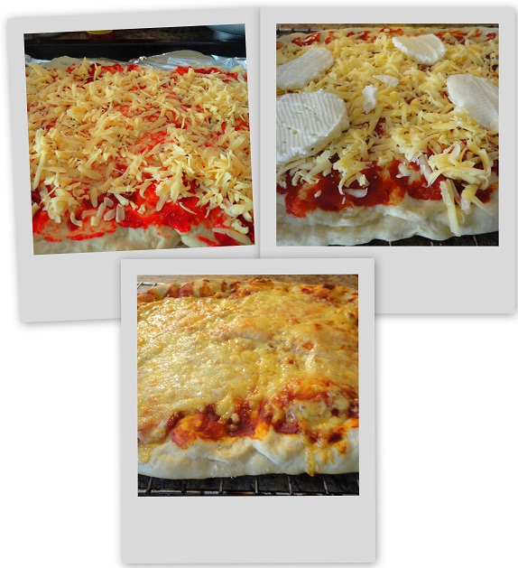 Wszystkie składniki poza koncentratem i serami, wymieszać i wyrobić ciasto. Tutaj możemy wykorzystać maszynę do wypieku chleba, w przeciwnym razie ciasto wyrabiamy ręcznie, bądź mikserem i odstawiamy w ciepłe miejsce do podwojenia objętości. Gotowe ciasto rozwałkować i wyłożyć na nie koncentrat pomidorowy. Na wierzch posypać starty ser edamski oraz plastry sera mozzarella. Piec w piekarniku nagrzanym do 230 C przez ok. 15 minut.