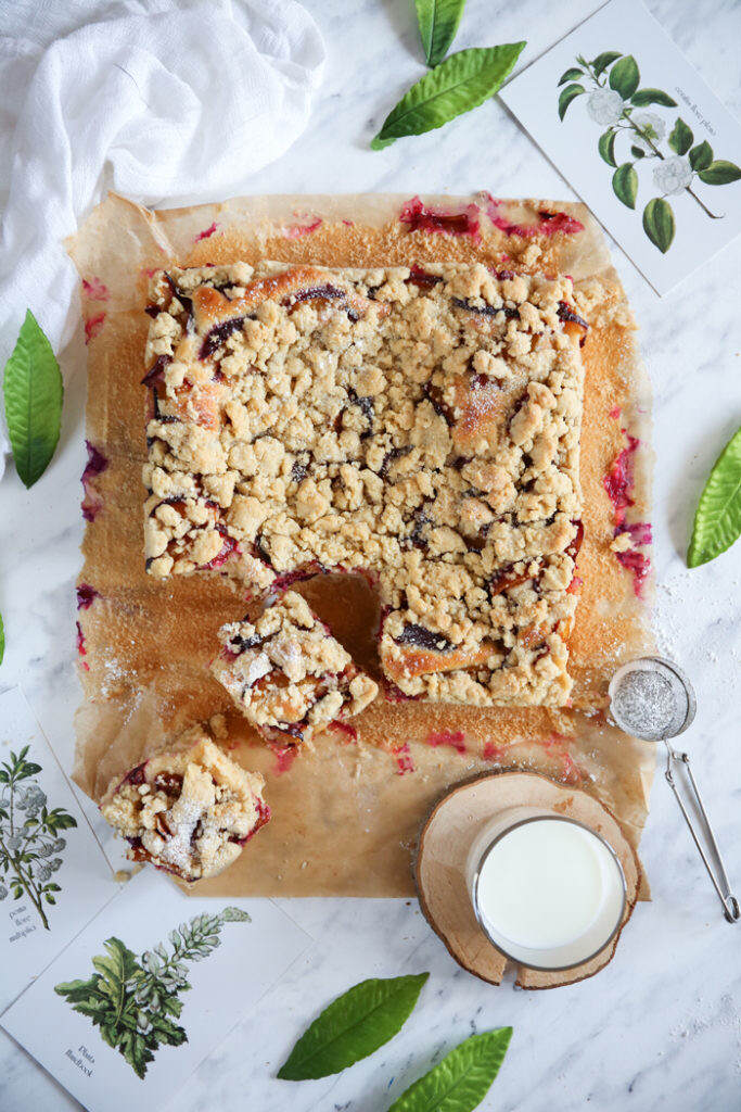 Wszystkie składniki (poza śliwkami) przełożyć do misy miksera wraz z przygotowanym zaczynem. Wymieszać przy użyciu haka do zagniatania ciasta (można ręcznie, ale ciasto będzie rzadkie). Przełożyć na blachę wyłożoną papierem do pieczenia, przykryć ręcznikiem kuchennym i odstawić w ciepłe miejsce na ok. godzinę do podwojenia objętości. Śliwki umyć, usunąć pestki, pokroić w cienkie plasterki. Ułożyć równomiernie na wyrośniętym cieście.