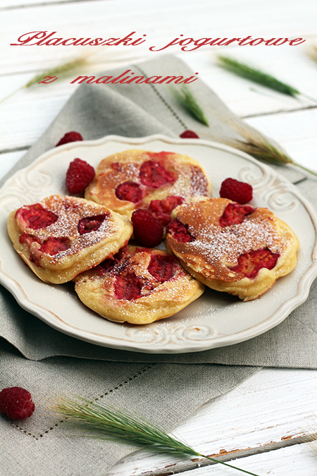 Jogurt wymieszać z jajkami i olejem (użyłam w tym celu widelca ; ). Dodać cukier, przesianą mąkę wraz z proszkiem do pieczenia oraz szczyptę soli. Dokładnie wymieszać do uzyskania jednolitej masy. Przy pomocy łyżki nakładać masę na rozgrzaną teflonową patelnię dodając do każdego placuszka kilka malin. Smażyć (bez dodatku tłuszczu) aż się ładnie zarumienią z obu stron. Przed smażeniem kolejnej partii warto przetrzeć patelnię ręcznikiem papierowym, aby zebrać sok, który wyciekł z owoców podczas smażenia ; ) Przed podaniem można udekorować cukrem pudrem.