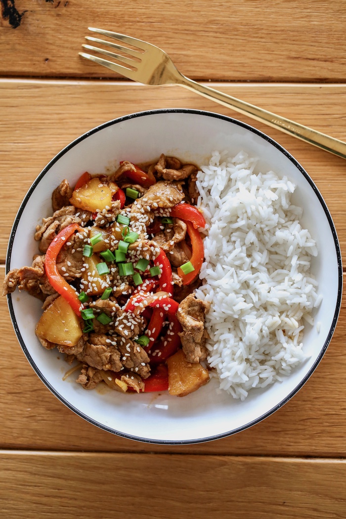 Wieprzowinę po chińsku z ananasem podawać z ryżem, szczypiorkiem i sezamem.