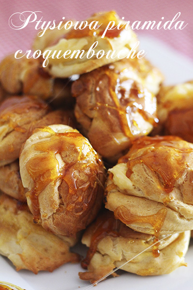 Zauważyłam, że ostatnio na blogu przedstawiam Wam więcej wypieków…; ) Na pewno ma to związek z obecną porą roku, w końcu nic tak nie rozgrzewa i nie poprawia nastroju jak dobre ciasto i kubek ciepłej herbaty ; ) Kiedy zobaczyłam te mini ptysie z dodatkiem kremu pâtissière, oblane gorącym karmelem, nie mogłam się powstrzymać! ; ) Mój mąż jest miłośnikiem parzonego ciasta, więc pozostając jeszcze w klimacie jego urodzin, okazja była idealna. Jest z nimi trochę pracy i jak widać moja piramida nie do końca wygląda tak jak powinna w tym klasycznym, francuskim torcie, ale było warto ; )