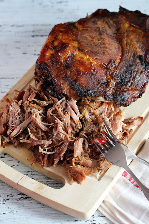 Po wyjęciu z piekarnika, przed pokrojeniem, odstawić mięso do przestygnięcia na około 45-60 minut i dopiero wtedy rozdzielić je na cienkie włókna.