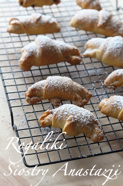Z okazji ostatniego Święta w naszym domu powstały ogromne zapasy rogalików ; ) Nie mogło zabraknąć rogali marcińskich, były także te z kruchego ciasta oraz rogaliki z powidłami z ciasta krucho-drożdżowego, na które przepis znalazłam w książce Siostry Anastazji. Jest to mój drugi wypiek z tej pozycji i kolejny raz się nie zawiodłam. Rogaliki wyszły bardzo mięciutkie, ciasto nie było mocno słodkie, ale nadrobiłam to przez posypanie ich cukrem pudrem ; ) Jako nadzienia możecie również użyć marmolady i nutelli, ten drugi wariant przetestowałam osobiście i smakowały mi nawet bardziej niż z powidłami… ; ) Polecam!