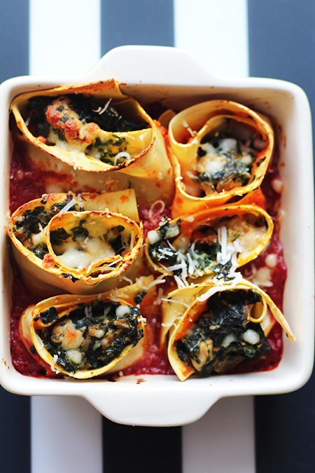 Marchewkę obrać, pokroić w 2-3 cm kawałki, zalać wodą, doprawić solą, szczyptą cukru i gotować pod przykryciem do miękkości (ok. 25 minut). Po tym czasie odcedzić i odparować nadmiar wilgoci w jeszcze gorącym garnku. Rozgnieść marchewkę za pomocą tłuczka do ziemniaków lub zmiksować blenderem. Na patelni rozgrzać 2 łyżki oliwy, dodać cebulę pokrojoną w kostkę i podsmażać przez 3 minuty. Dodać kurczaka pokrojonego w kostkę i podsmażać razem do czasu, aż kurczak nabierze złotego koloru. Dodać szpinak i smażyć do czasu aż nadmiar wody odparuje. Doprawić solą, pieprzem, gałką muszkatołową. Na drugiej patelni rozgrzać pozostałe 2 łyżki oliwy, dodać czosnek przeciśnięty przez praskę i podsmażać przez 30 sekund. Dodać passatę, doprawić szczyptą cukru, solą i pieprzem. Gotować na małym ogniu przez 10-15 minut. Piekarnik rozgrzać do 190 C (termoobieg). W dużym garnku, do osolonej wrzącej wody, wkładać na kilka sekund płaty lasagne, przestudzić. Kiedy płaty nie będą już gorące na każdy płat nałożyć łyżkę marchewkowego puree, rozsmarować. Dalej przełożyć warstwę szpinaku z kurczakiem, posypać startym na dużych oczkach serem mozzarella. Zwinąć w rulon i przekroić na 3 części. Do naczynia żaroodpornego wlać sos pomidorowy i ustawiać ściśle kawałki rotolo tak, aby widać było farsz. Wierzch posypać parmezanem. Przełożyć do piekarnika na 25-30 minut.