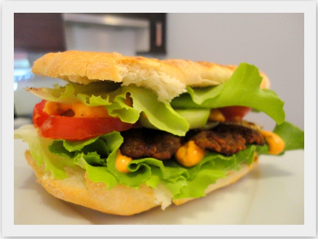 Bułkę grillować, aż ładnie się zrumieni. Rozciąć wzdłuż, ułożyć 2 liście sałaty, polać sosem, następnie nałożyć wędlinę, cebulę pokrojoną w krążki, pomidora oraz ogóra, ponownie polać sosem, przykryć liściem sałaty i drugą połówką bułki.