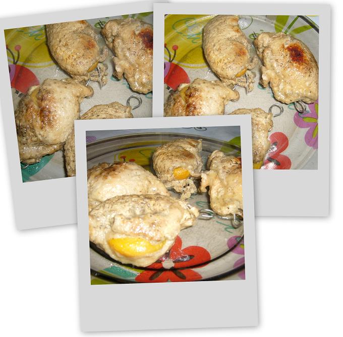 Schab rozbić tłuczkiem doprawić niewielką ilością soli i pieprzu. Na każdy kawałek nałożyć połówkę brzoskwini i uformować roladkę. Spiąć szpilką do zrazów lub wykałaczką. Mięso obtoczyć lekko w mące i podsmażać na gorącym oleju.