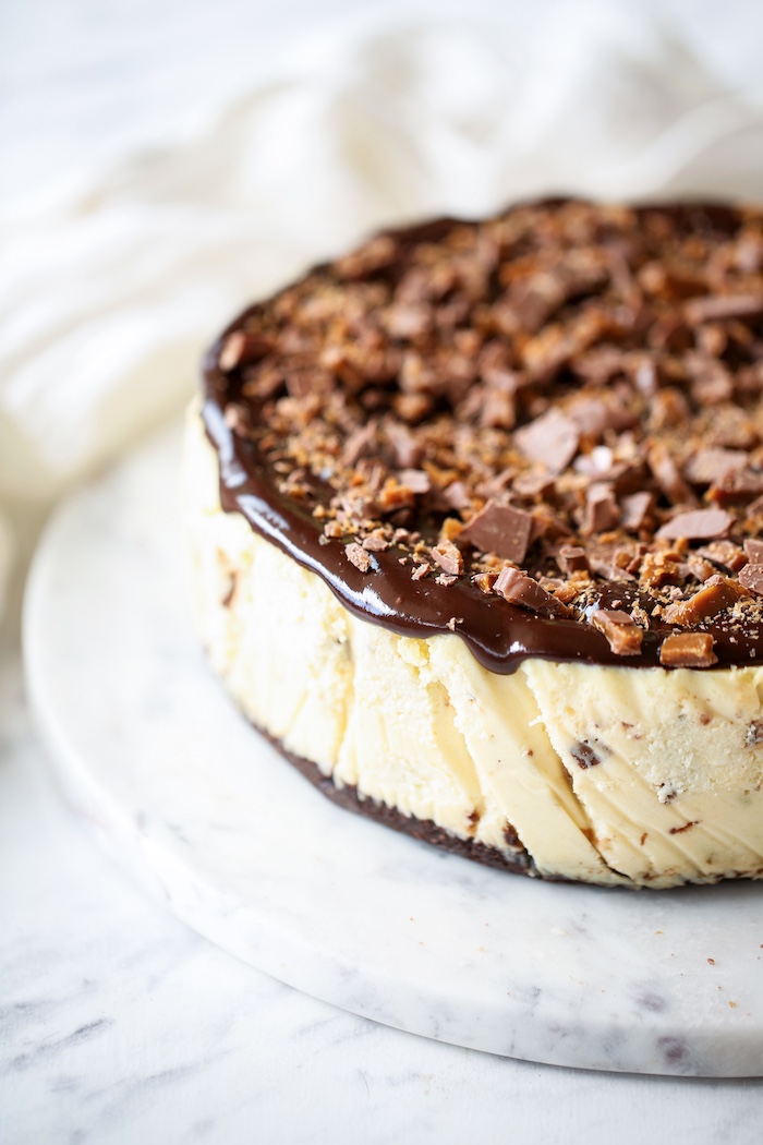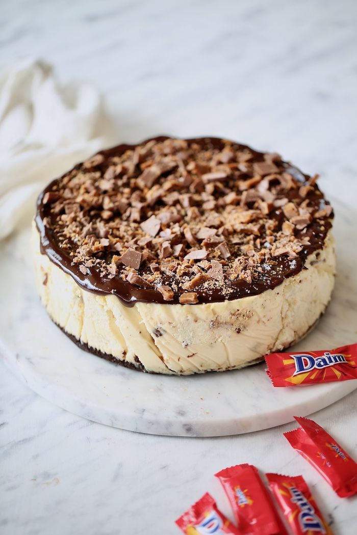 Twaróg, mleko skondensowane i szczyptę soli wymieszać na niewielkich obrotach miksera, tylko do połączenia się składników. Dodać budyń lub skrobię, wymieszać. Następnie kolejno dodawać po jednym jajku, ciągle miksując i nie zwiększając obrotów. Dodać połamane na mniejsze kawałki czekoladki Daim, delikatnie wymieszać. Masę przelać na ostudzony spód. Piec w piekarniku rozgrzanym do 175 C (góra-dół) przez 20 minut, a następnie zmniejszyć temperaturę do 120 C (góra-dół) i piec kolejne 90 minut. Po tym czasie studzić przy uchylonych drzwiczkach piekarnika, a następnie schłodzić przez co najmniej kilka godzin w lodówce.