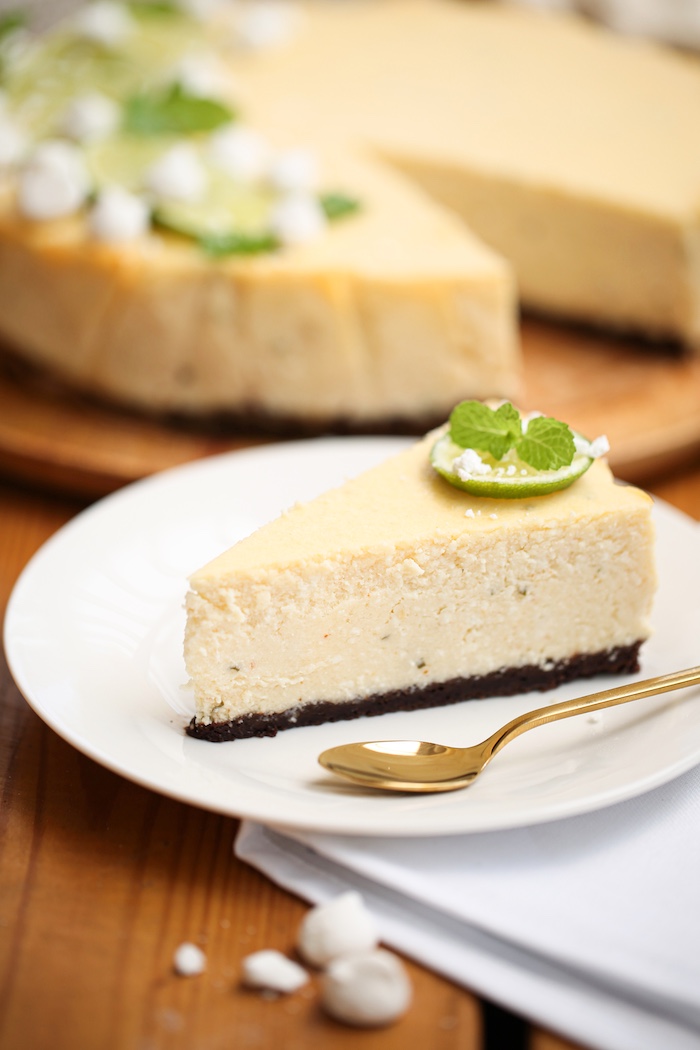 Twaróg, mascarpone, cukier i szczyptę soli wymieszać na niewielkich obrotach miksera, tylko do połączenia się składników. Dodać budyń lub skrobię, wymieszać. Następnie kolejno dodawać po jednym jajku, ciągle miksując i nie zwiększając obrotów. Dodać płynną kremówkę, rum, sok i otartą skórkę z limonki, posiekaną miętę. Wymieszać do połączenia. Masę przelać na ostudzony spód. Piec w piekarniku rozgrzanym do 175 C (góra-dół) przez 20 minut, a następnie zmniejszyć temperaturę do 120 C (góra-dół) i piec kolejne 90 minut. Po tym czasie studzić przy uchylonych drzwiczkach piekarnika, a następnie schłodzić co najmniej kilka godzin w lodówce.