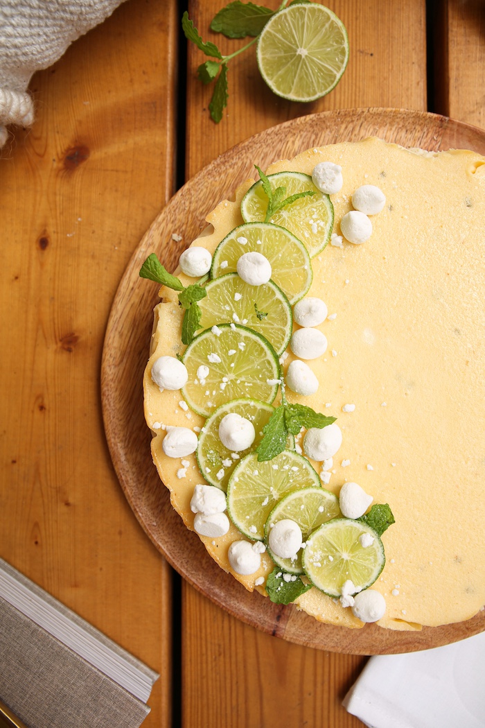 Twaróg, mascarpone, cukier i szczyptę soli wymieszać na niewielkich obrotach miksera, tylko do połączenia się składników. Dodać budyń lub skrobię, wymieszać. Następnie kolejno dodawać po jednym jajku, ciągle miksując i nie zwiększając obrotów. Dodać płynną kremówkę, rum, sok i otartą skórkę z limonki, posiekaną miętę. Wymieszać do połączenia. Masę przelać na ostudzony spód. Piec w piekarniku rozgrzanym do 175 C (góra-dół) przez 20 minut, a następnie zmniejszyć temperaturę do 120 C (góra-dół) i piec kolejne 90 minut. Po tym czasie studzić przy uchylonych drzwiczkach piekarnika, a następnie schłodzić co najmniej kilka godzin w lodówce.