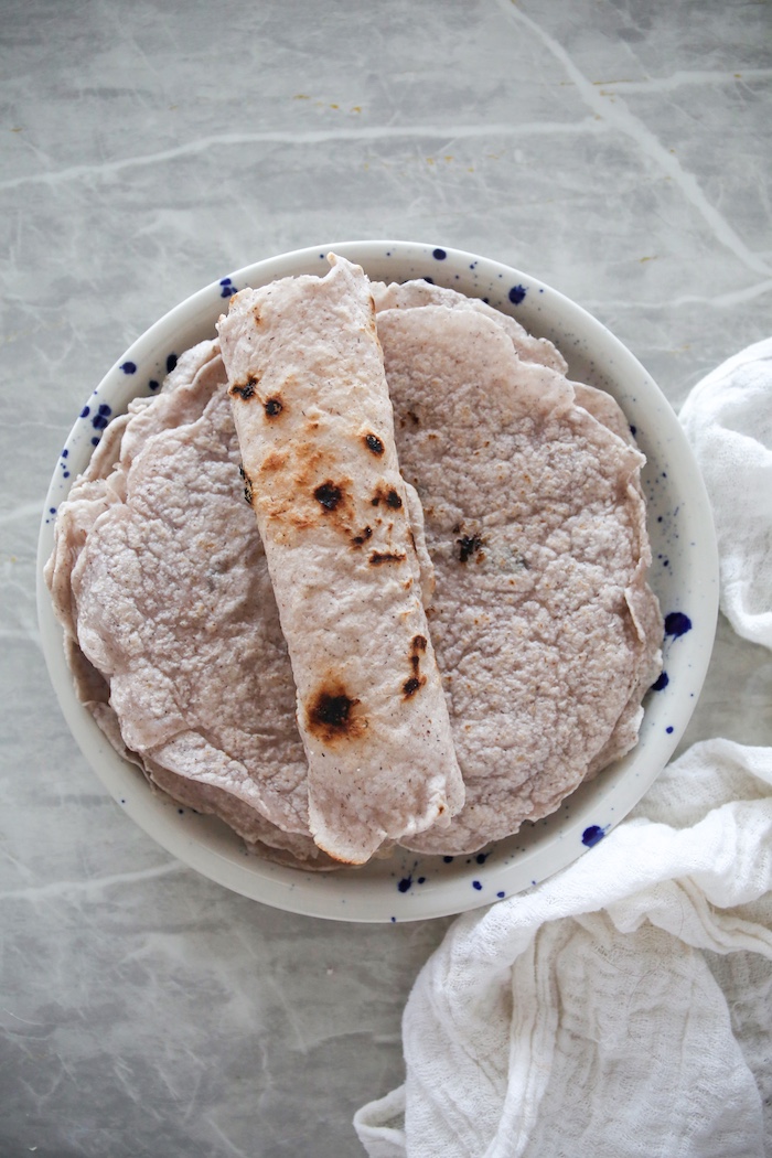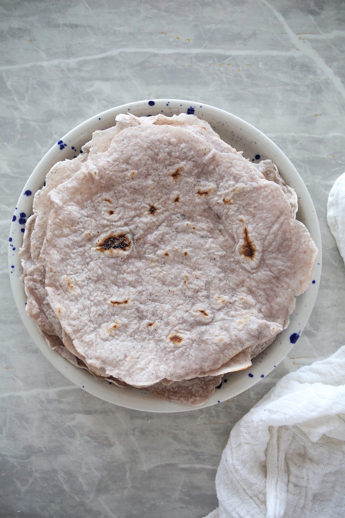 Łuski babki jajowatej zalać ciepłą wodą, wymieszać i odstawić. Po około 15-20 sekundach utworzy się żel. Mąkę wymieszać z solą, dodać olej i przygotowany żel. Wyrobić sprężyste i elastyczne ciasto, można użyć robota kuchennego. Ciasto podzielić na 12 równych części i każdą z nich rozwałkować na cienki placek. W razie potrzeby można delikatnie podsypać mąką bezglutenową.