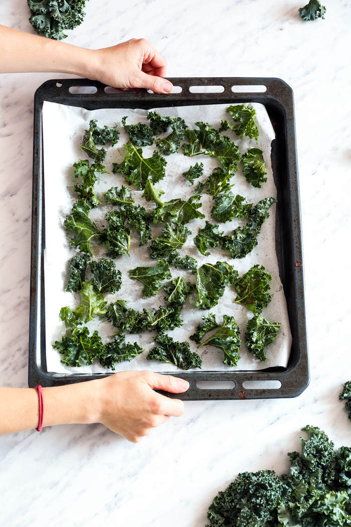 Jarmuż umyć, osuszyć. Usunąć twardą łodygę, liście podzielić na mniejsze kawałki. Dodać olej i przyprawy i dokładnie wymieszać, tak aby każdy liść był dokładnie pokryty. Przełożyć na blachę wyłożoną papierem do pieczenia (chipsy nie mogą na siebie nachodzić) i piec w piekarniku rozgrzanym do 150 C (termoobieg) przez około 7 minut do czasu aż będą chrupiące. W razie potrzeby zwiększyć czas pieczenia o około 1-2 minuty ; )